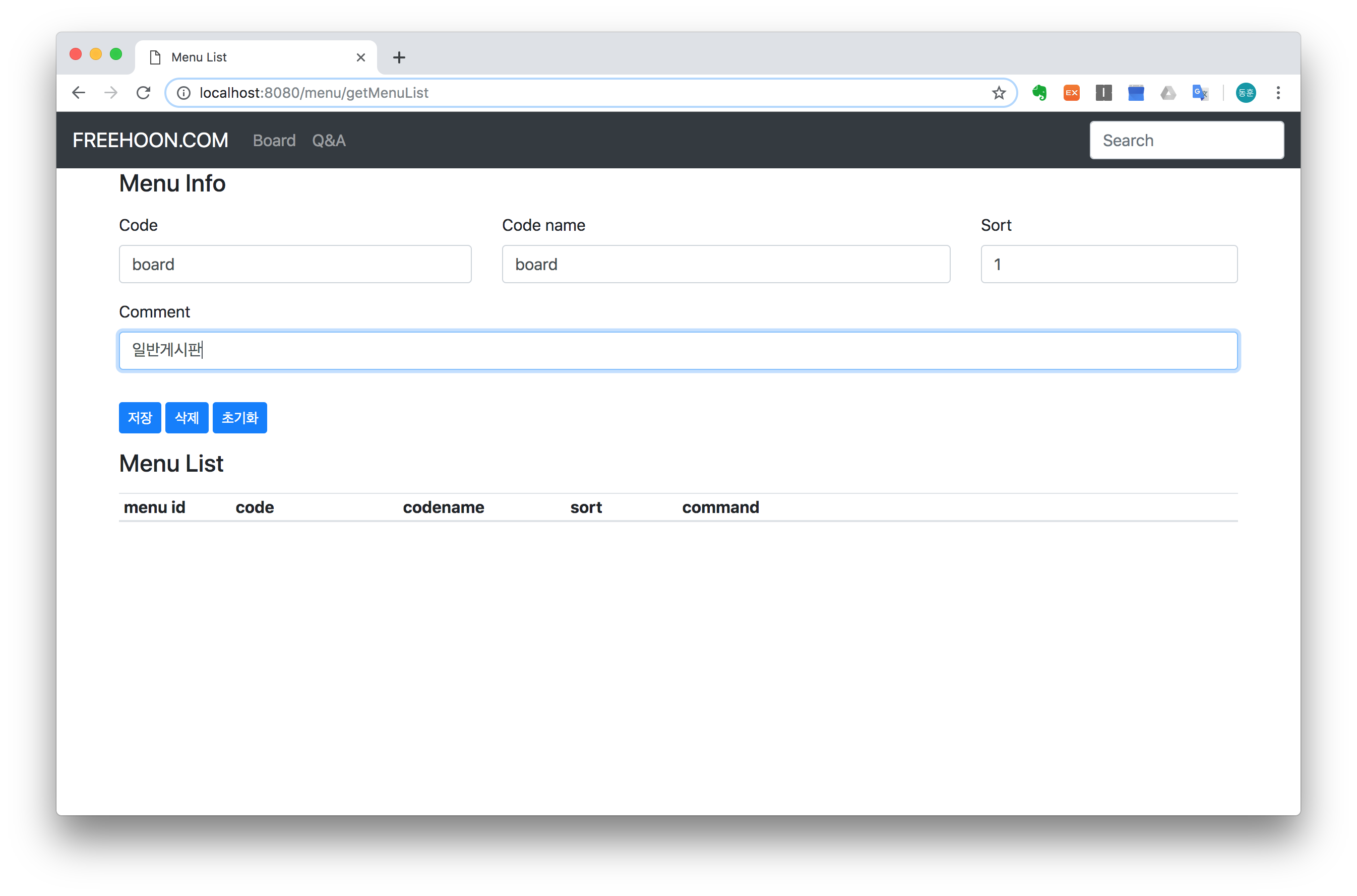 메뉴 관리 프로그램을 일반 게시판 프로그램과 동일한 형태로 만들어도 상관 없지만, 조금 다른 형태를 취하려고 합니다. 한 화면에 메뉴의 정보를 입력하는 form 화면과, 메뉴의 리스트 화면을 모두 구현할 예정입니다. 따라서 메뉴의 화면과 메뉴의 리스트에 대한 각각의 view가 필요하지 않습니다. 이렇게 구현하기 위해 메뉴 관리 프로그램에서는 jQeury의 ajax를 상당히 많이 사용합니다.