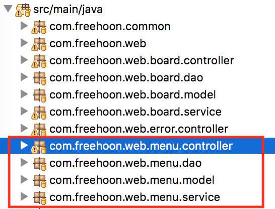 먼저 메뉴의 정보를 담을 VO 클래스를 만들어 봅니다. 위치는 [com.freehoon.web.menu.model] 패키지 아래 입니다.