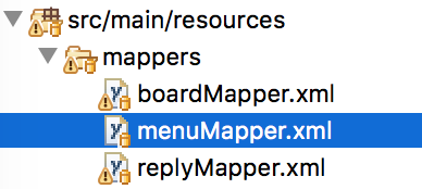 우선 SQL 문을 처리 할 수 있는 기본적인 Mapper를 작성하도록 합니다. 아래 그림과 같이 [src/main/resources > mapper] 폴더에 menuMapper.xml을 작성합니다.