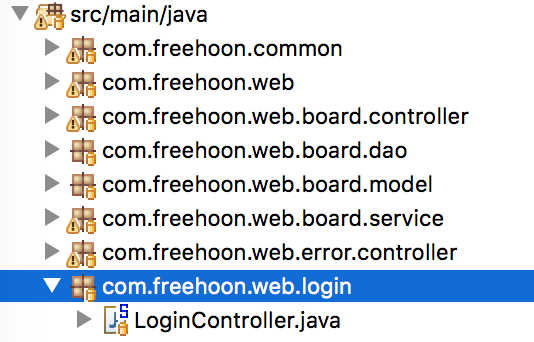 우선 url을 입력 했을때 요청을 처리할 Controller먼저 작성해 봅니다. login 관련 컨트롤러는 지금까지와는 다르게 패키지를 작성 하였습니다.