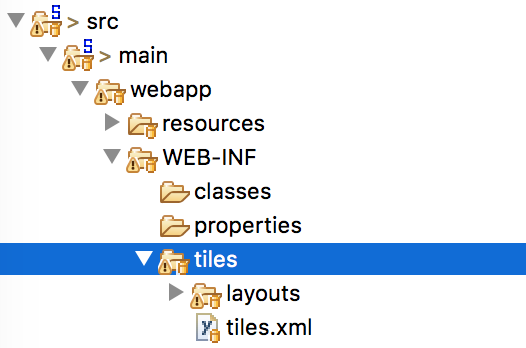 아래와 같이 tiles 관련 디렉토리를 신규 생성하고, tiles.xml 이라는 파일을 만들어 추가해 줍니다.