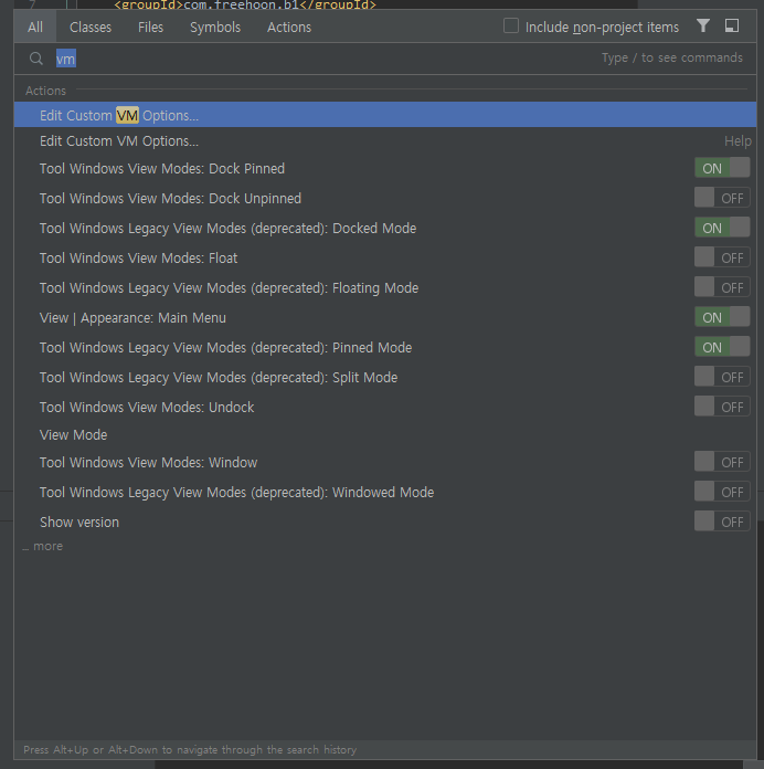 조회된 항목 중에서 맨 위에 있는 'Edit Custom VM Options...' 를 클릭하자.