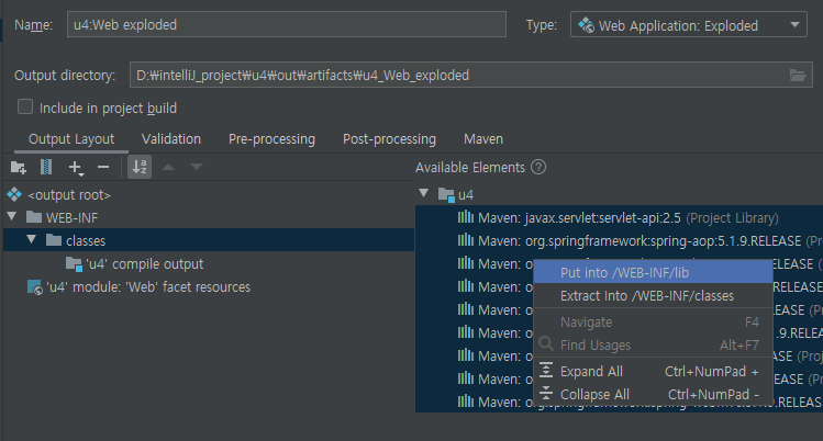 'Put into /WEB-INF/lib' 를 클릭하면 우측에 'lib' 디렉토리가 생성되면서 모두 이동하게 됩니다.