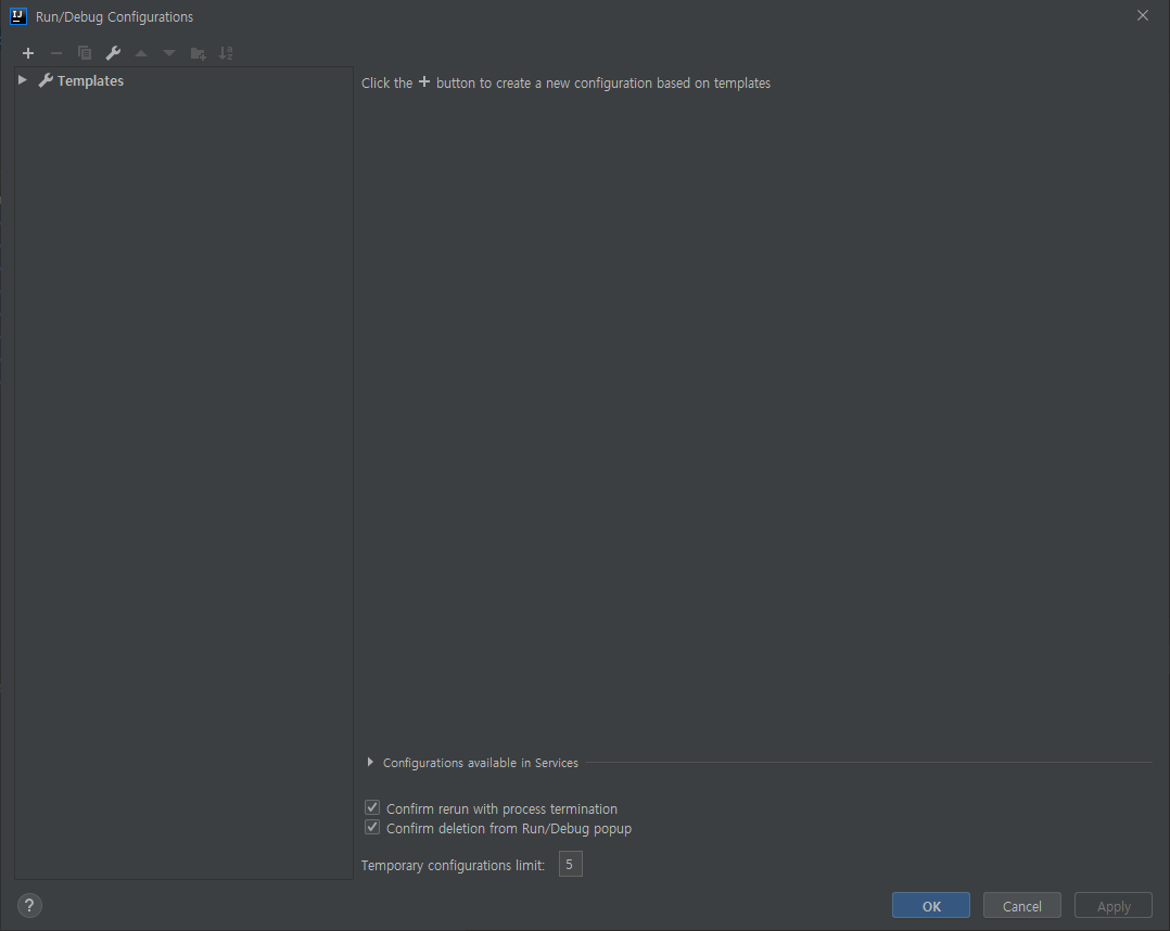아래와 같은 'Run/Debug Configurations' 화면에서 좌측 상단에 있는 '+' 아이콘을 클릭 합니다.