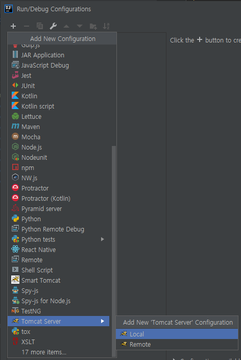 목록 중에서 tomcat Server 을 선택 합니다. 목록에 tomcat server 이 보이지 않는다면 아래 있는 more item 을 클릭하여 더 아래로 내려가 봅니다. 그리고 local을 선택합니다.