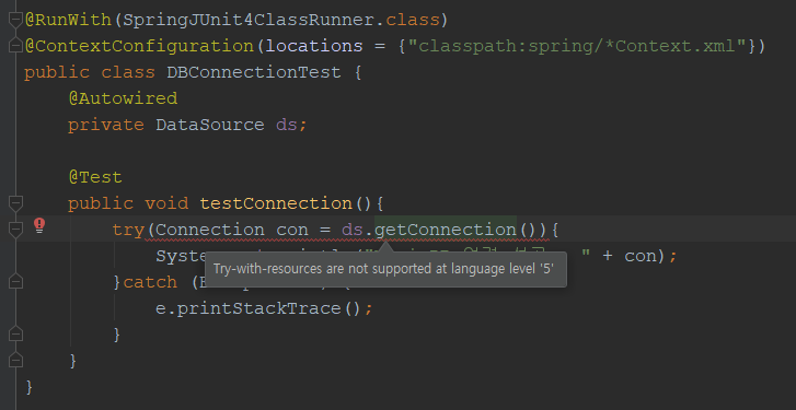 이것은 자바 버전에 의해 생기는 문제 인데 위에서 사용한 try 는 try - with - resources 라고 부르는 방식으로
