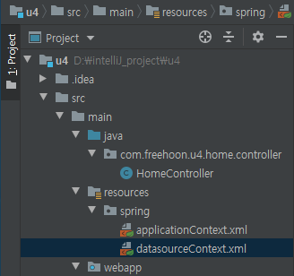또한 데이터베이스 설정을 위한 스프링 설정 파일로 datasourceContext.xml 을 생성 하도록 합니다.