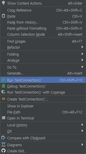 위와 같이 코드를 입력한 후 파일을 우클릭하여 'Run 'TestConnection()' 이라는 메뉴를 선택합니다.